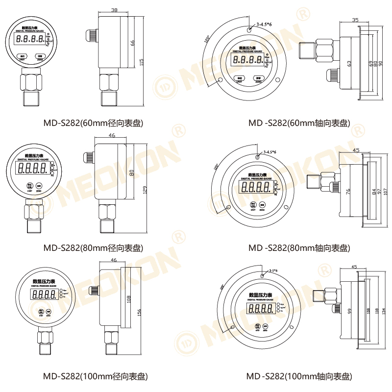 該系列數(shù)顯壓力表包括表盤直徑為60mm/80mm/100mm三款徑向不銹鋼壓力表, 60mm/80mm/100mm三款軸向不銹鋼數(shù)顯壓力表。